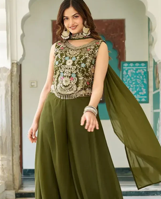 Palazzo suits have gained immense popularity for their versatile styling options. The wide-legged palazzo pants paired with various types of tops can be worn for casual gatherings, office events, or festive occasions. Key features include: